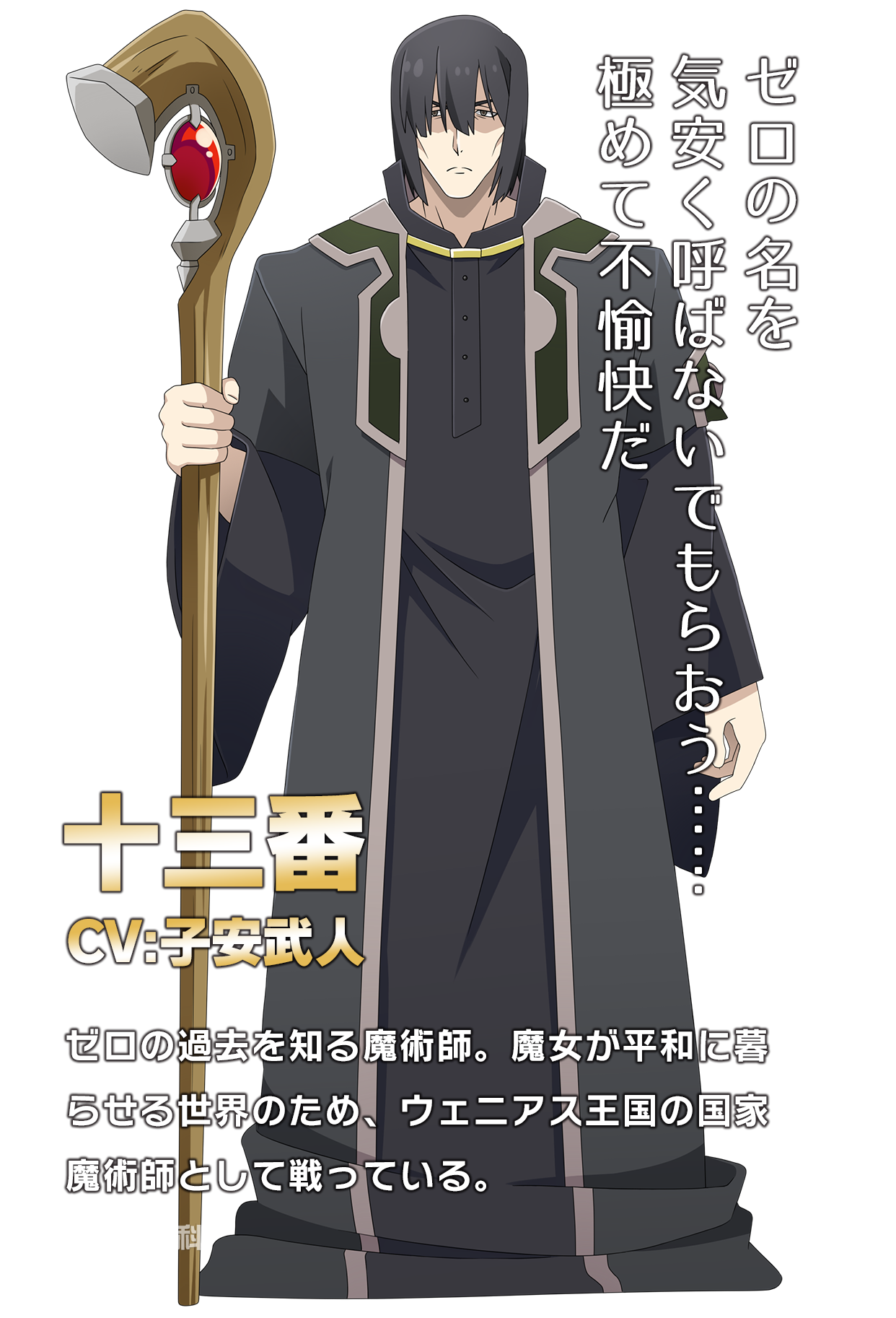 主要武器:魔法杖 魔法技能:擅长雷属性魔法,禁章·最终项—〈黑虚〉,拥有魔法阵天赋 徒弟:七号(威尼亚斯王国的王子) 零的哥哥,妹控,孤傲的魔法师,擅长游说洗脑和离间。小说第一卷出现,零之魔术团口中的<那位大人>,与恶魔做了契约交易,以牺牲了自己的容貌和身体作为魔力交换。小说前期为黑发,后期结束契约后恢复白发。杀死了同门其他号数的魔女后来到了威尼亚斯王国做了国家魔法师。