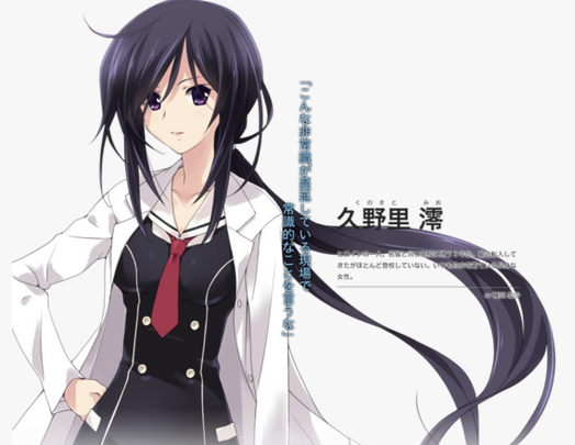 久野里澪,所属动漫《混沌之子CHAOS;CHILD》中的人物。曾在美国的研究机构工作,现与拓留念同一所高中的3年级学生,不怎么去学校,一直都穿着白色大的高个子女生。与命运石之门的主角们有联系。持有与《混沌之脑》的女主角之一苍井濑名的Di-Sword相似的巨剑。