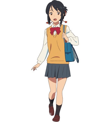 宫水三叶,动画电影《你的名字。》及衍生作品的女主角,一名住在深山乡间小镇糸守镇的女高中生。身为镇长的父亲离家在外,和还是小学生的妹妹以及祖母三个人生活。在睡梦中不经意地与立花泷交换身体,体验了一番东京大都市生活并与泷逐渐相知、相恋,两人经过努力拯救了因彗星坠落即将毁灭的小镇,于2021年再次相遇。